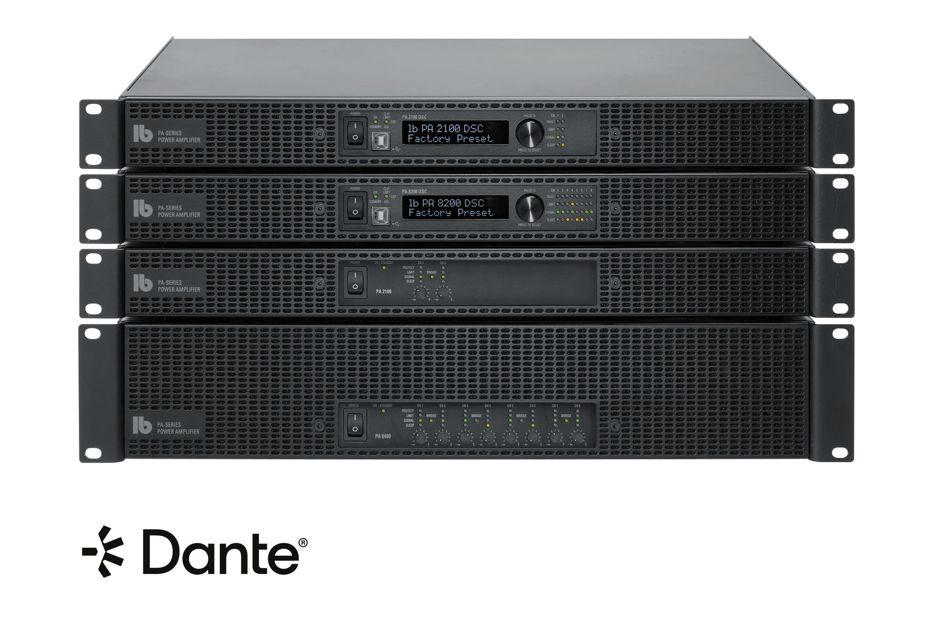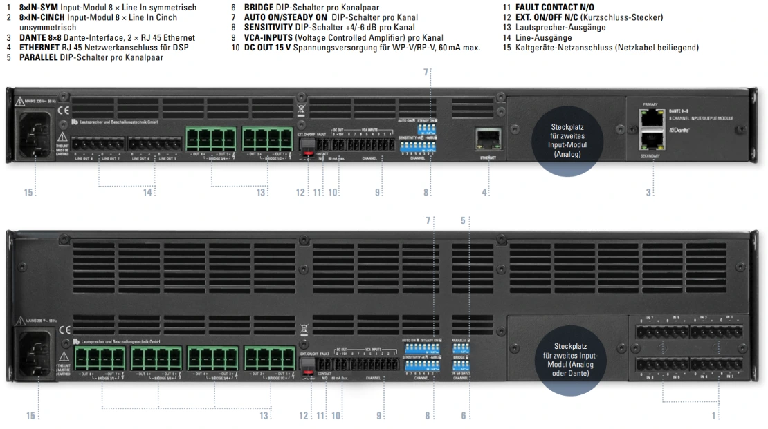 Alle Endstufen-Modelle werden in drei Modell-Varianten mit unterschiedlichen Input-Modulen angeboten. Sie sind entweder mit symmetrischen Line-Eingängen, unsymmetrischen Cinch-Eingängen oder einem Dante-Interface ausgestattet. Bei Bedarf können die Verstärker mit einem zweiten Input-Modul erweitert werden, um verschiedene Arten von Signalquellen zu kombinieren. Beispielsweise kann ein Teil der Input-Kanäle analog und ein anderer über Dante angesteuert werden.